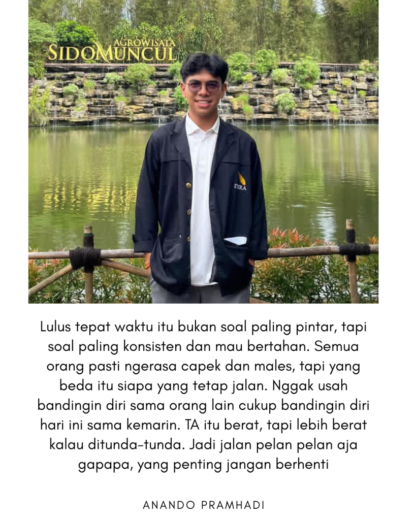 Lewat tulisan ini, kami merangkum informasi, tips dan trik serta motivasi untuk teman-teman yang masih berproses dan berjuang menyelesaikan TA dari hasil wawancara bersama lima mahasiswa tersebut.