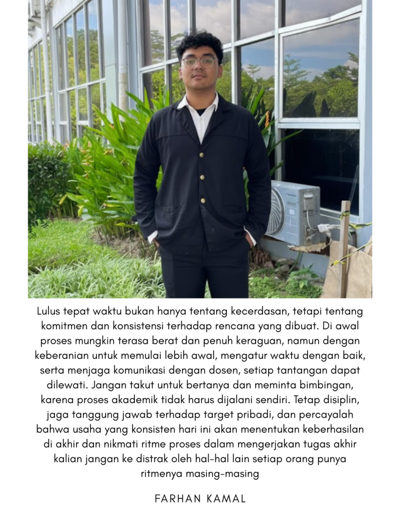 Program Studi Teknik Lingkungan Itera kembali mencatatkan capaian akademik membanggakan. Sebanyak lima mahasiswa angkatan 2022 berhasil menyelesaikan studi dan melaksanakan Sidang Tugas Akhir (TA) tepat waktu dalam 3,5 tahun: Rosa Salsabila Alwafi, Cheisyha Alfiradina, Farhan Kamal, Anando Pramhadi, dan Verani Jesika. Pencapaian ini menjadi bukti bahwa kelulusan tepat waktu bukan sesuatu yang “mustahil”, melainkan hasil dari komitmen, strategi, dan konsistensi yang dijalankan sejak awal.